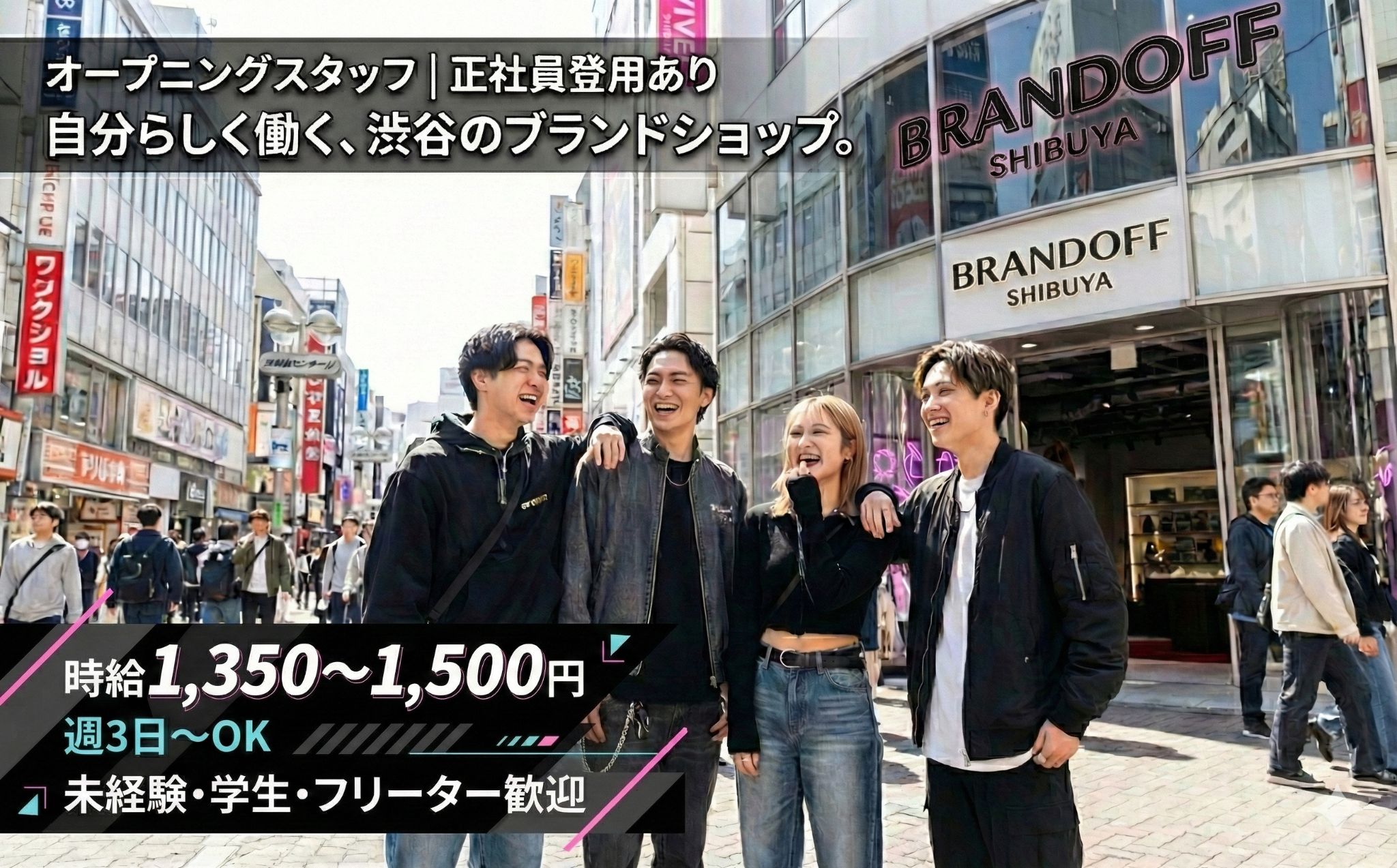 | 求める人材 | 必須スキル・経験・資格 求める人材 【渋谷で働きたいその気持ち、大歓迎】 ファッションやブランドが好きな方 人と話すのが好きで、笑顔を大事にできる方 身振り手振りで海外のお客様にも対応できる方 SNS発信・動画編集に興味がある方 指摘を素直に受け止めて、成長できる方 掛け持ち(Wワーク)をしていない方 フリーターさん歓迎!(学生は1~2名まで採用予定) エントリーフォームよりご応募ください。 備考欄に ・前職のポジション ・今までのキャリア ・ご経験 をご記載ください。 |