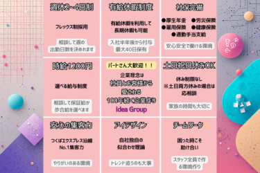 | 休日・休暇 | 完全週休2日制 *シフト制 スタッフと話し合い、お休みを決定していきます。 *土曜・日曜・祝日のお休みも相談OK! *有給休暇あり!申請により連休も可能! ◎店舗により、定休日がある場合もあります |