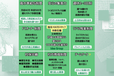 | 待遇 | <健康・保険制度> ・労災保険・厚生年金・健康保険・雇用保険 ・健康診断 ・残業軽減サロン <各種研修制度> ・新人研修 ┗ZOOMや施設に集まり、経営理念・手順・理論などを学ぶ勉強会 ・定期研修 ┗年に数回、全体での経営研修、レクリエーション研修を行います。 ・適正評価制度 ・ライフプラン設計セミナー ・FCオーナー勉強会 ・独立支援 ・キャリアアップ支援 ・研修、セミナー参加費用補助 <自分のメンテナンスもお得に!> ・系列店・グループ店での施術割引 ・提携美容クリニック施術割引 ・提携美容院施術割引 <社内交流も行っています> ・BBQなどの社内イベント ・優秀社員表彰 <リファラル採用、やってます!> ・スタッフ紹介報酬 ┗ご紹介者様とご入社された方の双方に支給! 【社会保険について】 厚生年金、健康保険、雇用保険、労災保険 |