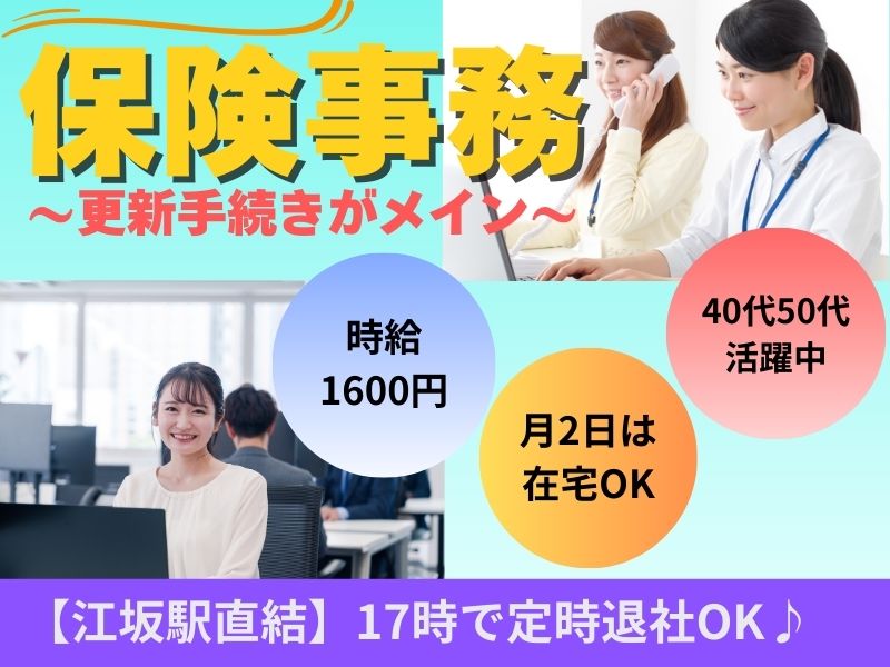 【保険事務 更新手続きメイン】1600円/17時退社OK/江坂駅直結/40代50代活躍中/月2回在宅可能